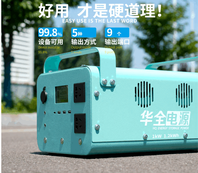舉例來說,如華全HQDY-1000-A戶外電源,額定功率1000W,電量為1200Wh(≈1.2度電),而1度電可以讓電動汽車跑5~8公里,這個距離足以應付很多事了。