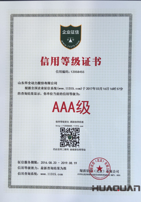 3月27日,華全動力正式獲得了11315綠盾全國企業征信系統頒發的AAA級企業信用等級證書。